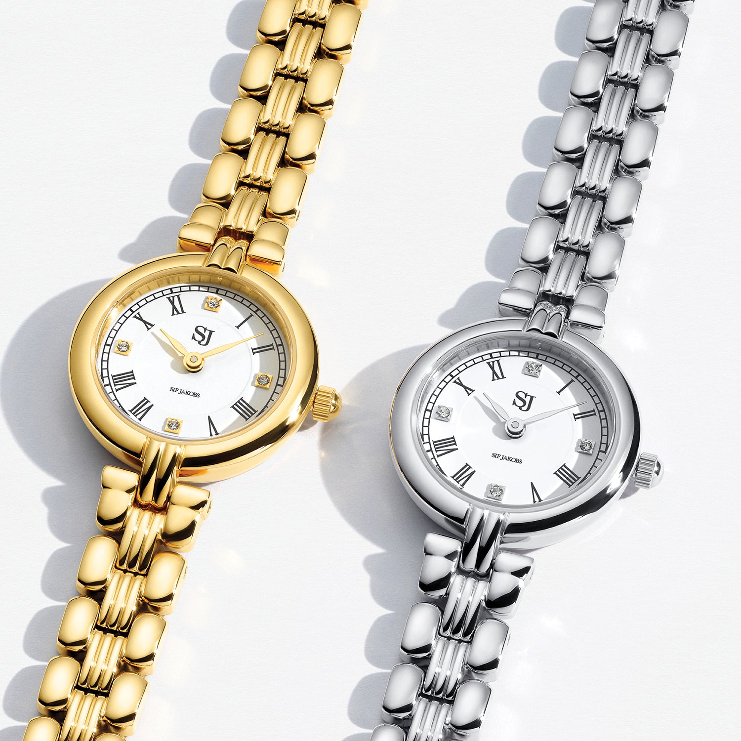 Meet Isabella, our newest watch, featuring rounded edges, a sculpted link bracelet and a soft, graceful silhouette. The Roman numeral dial adds a touch of vintage character, balanced by a clean, contemporary look. Offered in silver and gold, Isabella is designed to elevate every day with effortless elegance.