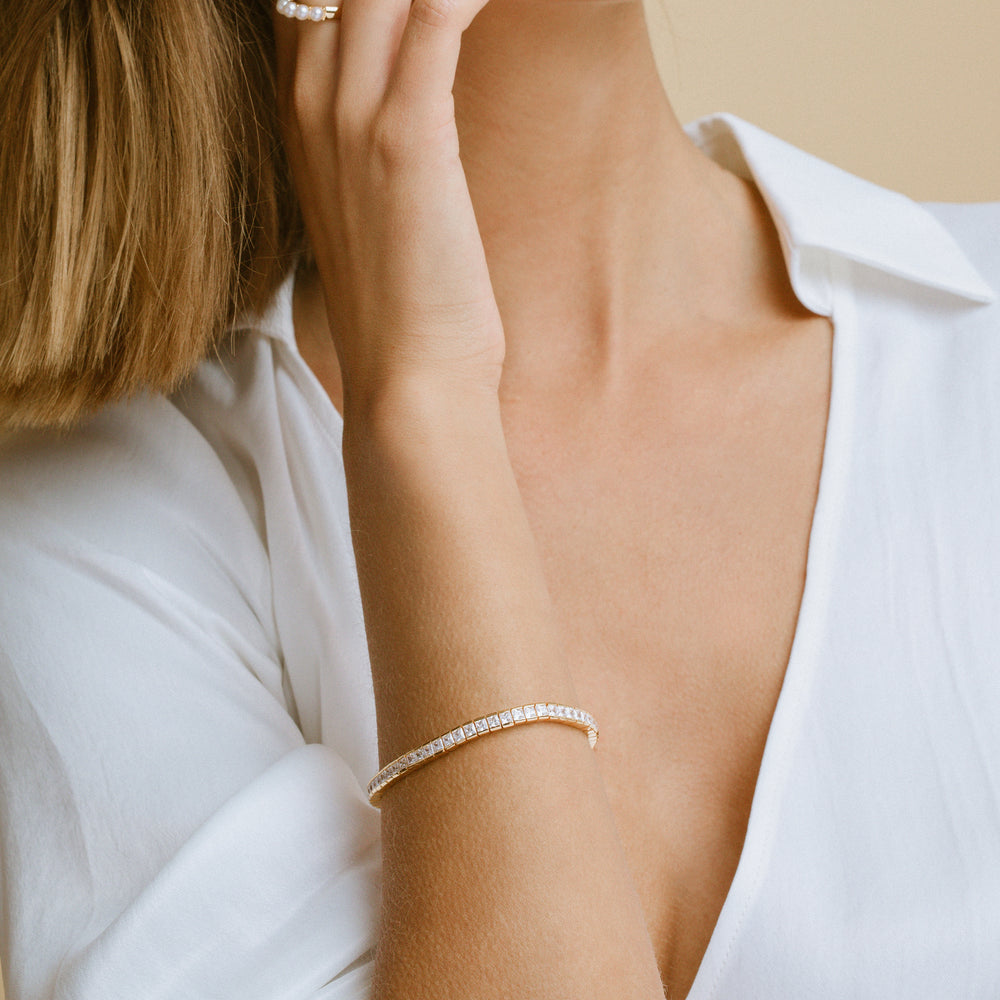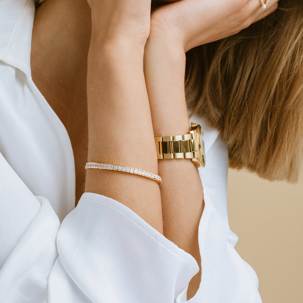 Bracelet made of 18 karat gold plated 925 Sterling silver, polished surface and facet cut white zirconia.