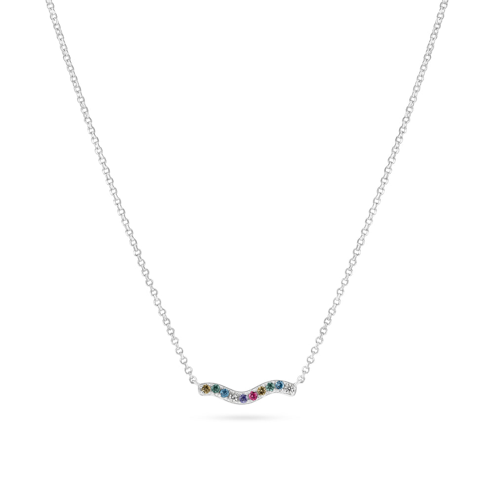 Necklace made of rhodium plated 925 Sterling Silver, a polished surface, and handset with facet cut multicoloured zirconia