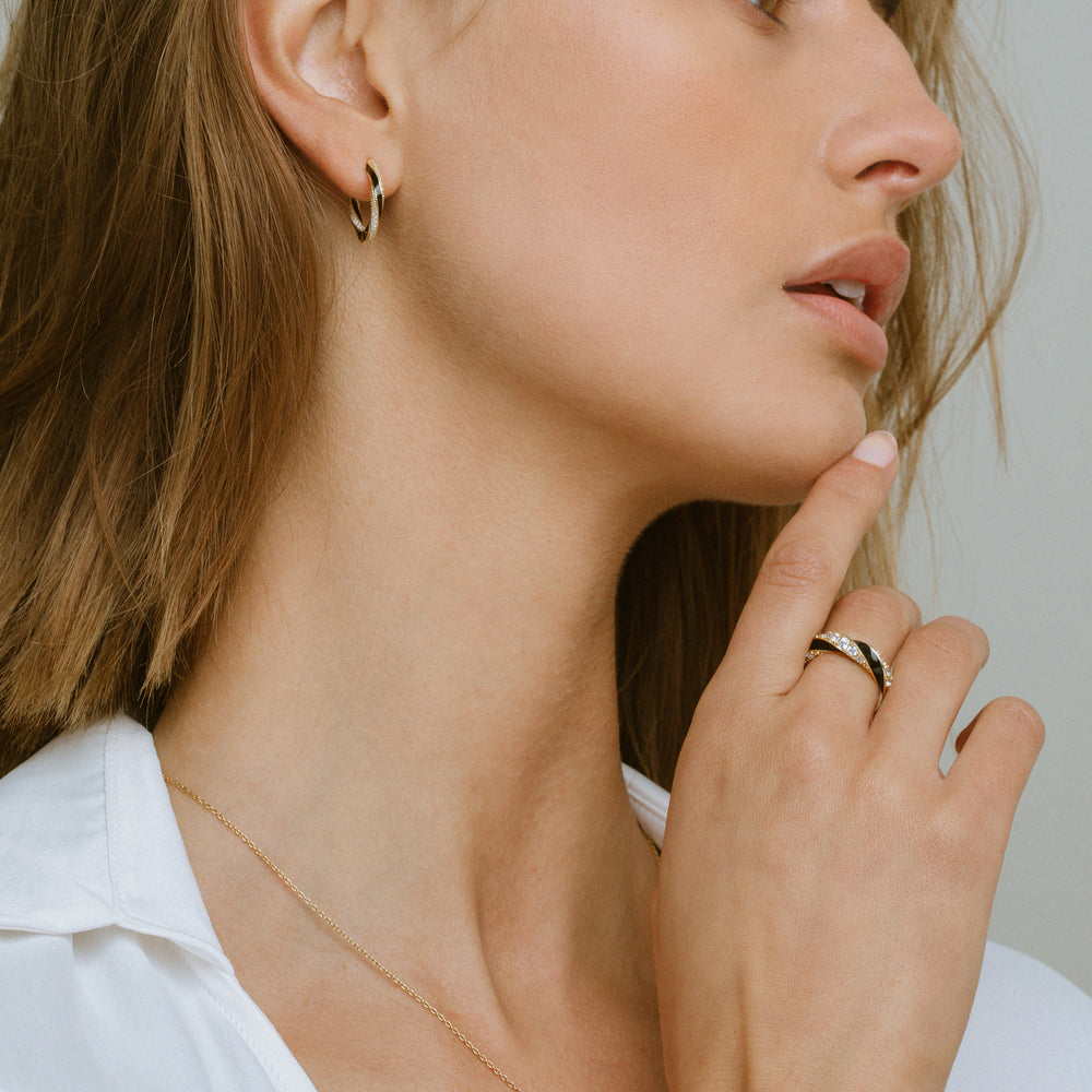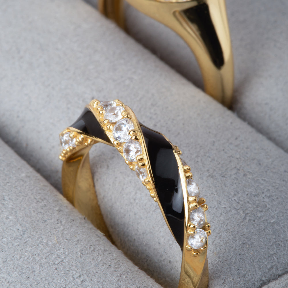 Ring made of 18 karat gold plated 925 Sterling silver, polished surface, and hand set with facet cut white zirconia and black enamel.