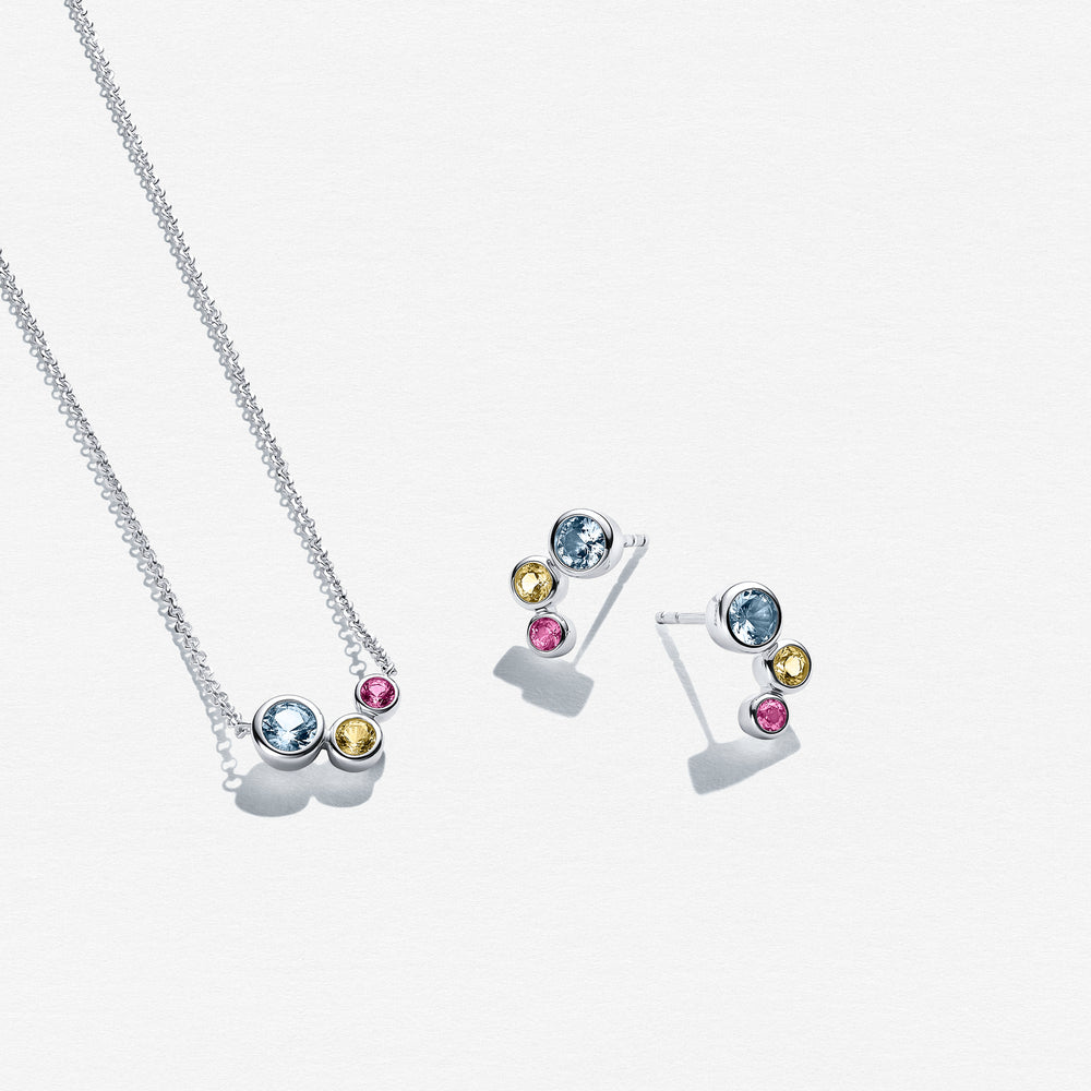 Set made of rhodium plated 925 Sterling Silver, with a polished surface and handset with facet cut multicoloured zirconia.